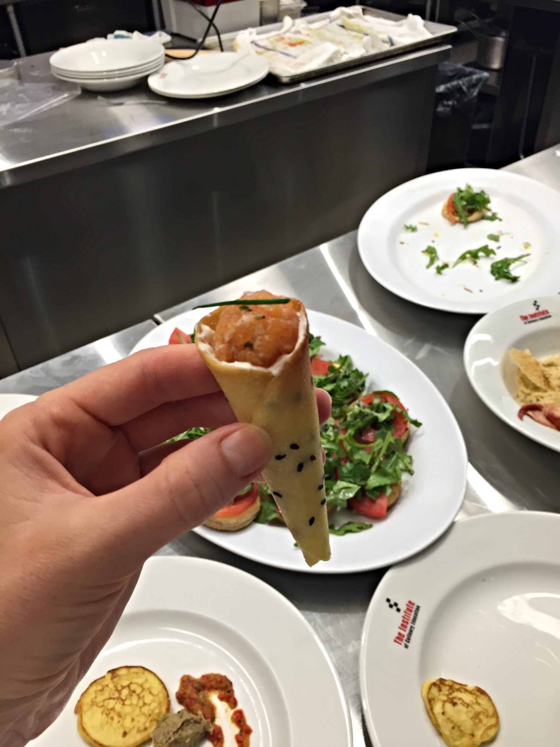 My experiences at Per Se and French Laundry sandwiched my completion of culinary school, where, ironically, we cooked Thomas Keller’s recipes on my last day. I had the privilege of making these salmon cornets, which were served at the Amex Per Se dinner in June and at our French Laundry dinner in August. Who made it best?!?